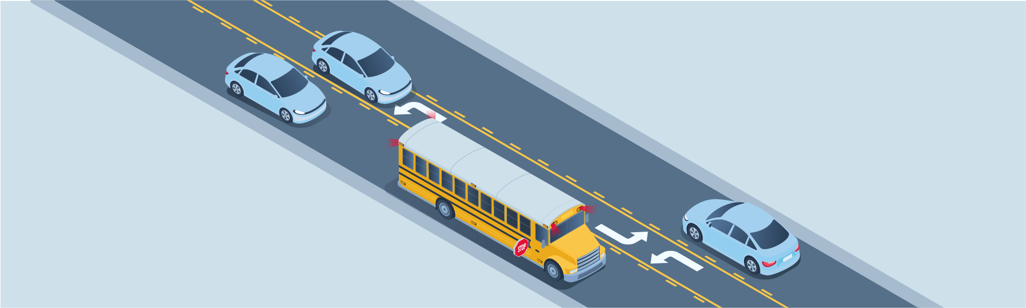 When driving on a roadway with four or more lanes with a center turning lane, what must you do if a school bus stops to pick up or drop off passengers? |